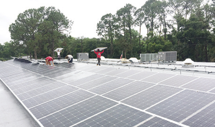Eventually, the decision was made to fix the roof, and more. After nine months, during which countless delays brought about by Hurricane Irma made things even worse, the firm is closing in on completion of a project that features a large solar panel farm that is set to generate enough solar power to run the building.